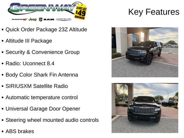 4WD, ABS brakes, Altitude III Package, Automatic temperature control, Black Headlamp Bezels, Black Roof Molding, Black Suede Seats w/Black Stitching, Body Color Claddings, Body Color Fascias, Body Color Grille w/Platinum Accent, Body Color Shark Fin Antenna, Dark Lens Taillamps, Delete Laredo Badge, Dual Bright Exhaust Tips, Electronic Stability Control, Fully automatic headlights, Gloss Black Fascia Applique, Jeep Black Gloss Badging, MIC Black Bezels, Neutral Gray Satin Gloss Tail Lamp, ParkSense Rear Park Assist System, ParkView Rear Back-Up Camera, Power 4-Way Driver Lumbar Adjust, Power 8-Way Driver/Manual Passenger Seat, Power Liftgate, Quick Order Package 23Z Altitude, Radio: Uconnect 8.4, Rear-View Auto-Dimming Mirror w/Microphone, Security & Convenience Group, SIRIUSXM Satellite Radio, Steering wheel mounted audio controls, Universal Garage Door Opener, Wheels: 20" x 8.0" Gloss Black Aluminum. CARFAX One-Owner. Reviews: * Strong and fuel-efficient engine lineup, including diesel V6; upscale interior; plenty of luxury and technology-oriented features; irrefutable off-road ability; outlandish SRT model. Source: Edmunds